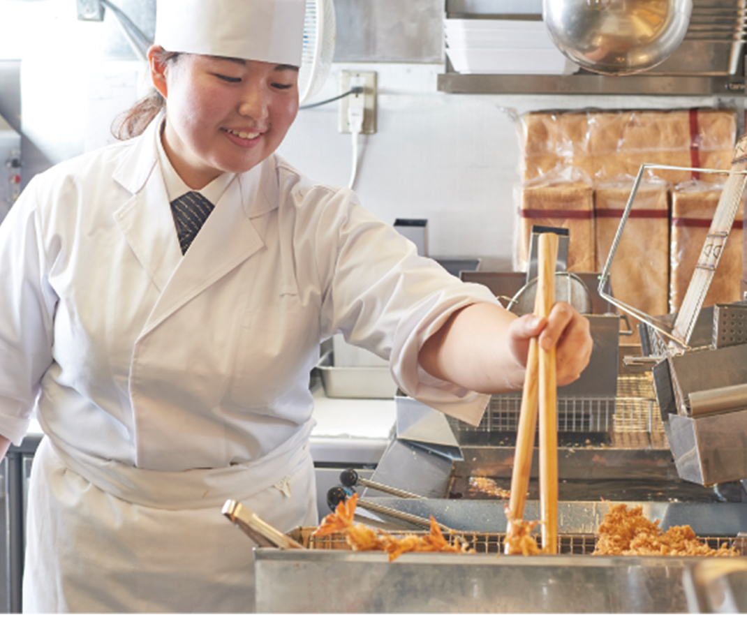 おすすめポイントは、調理・営業技能検定試験、接客コンテストといった、自身のスキルアップに大いに繋がる明確な制度があり、頑張りがしっかり評価されることです。興味のある方は、是非一緒にとんかつを通してお客様に幸せを届けましょう。