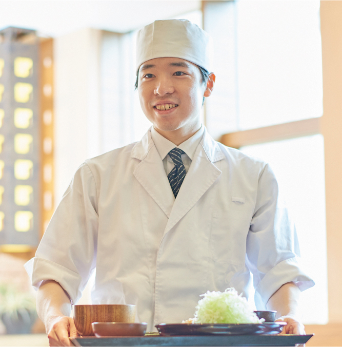 社内の技能検定試験では早々に調理・営業共に3級を取得。日々の努力や人柄が評価されて、3年目にはチーフへ昇格。現在は店長を補佐する立場として店舗を盛り上げている。